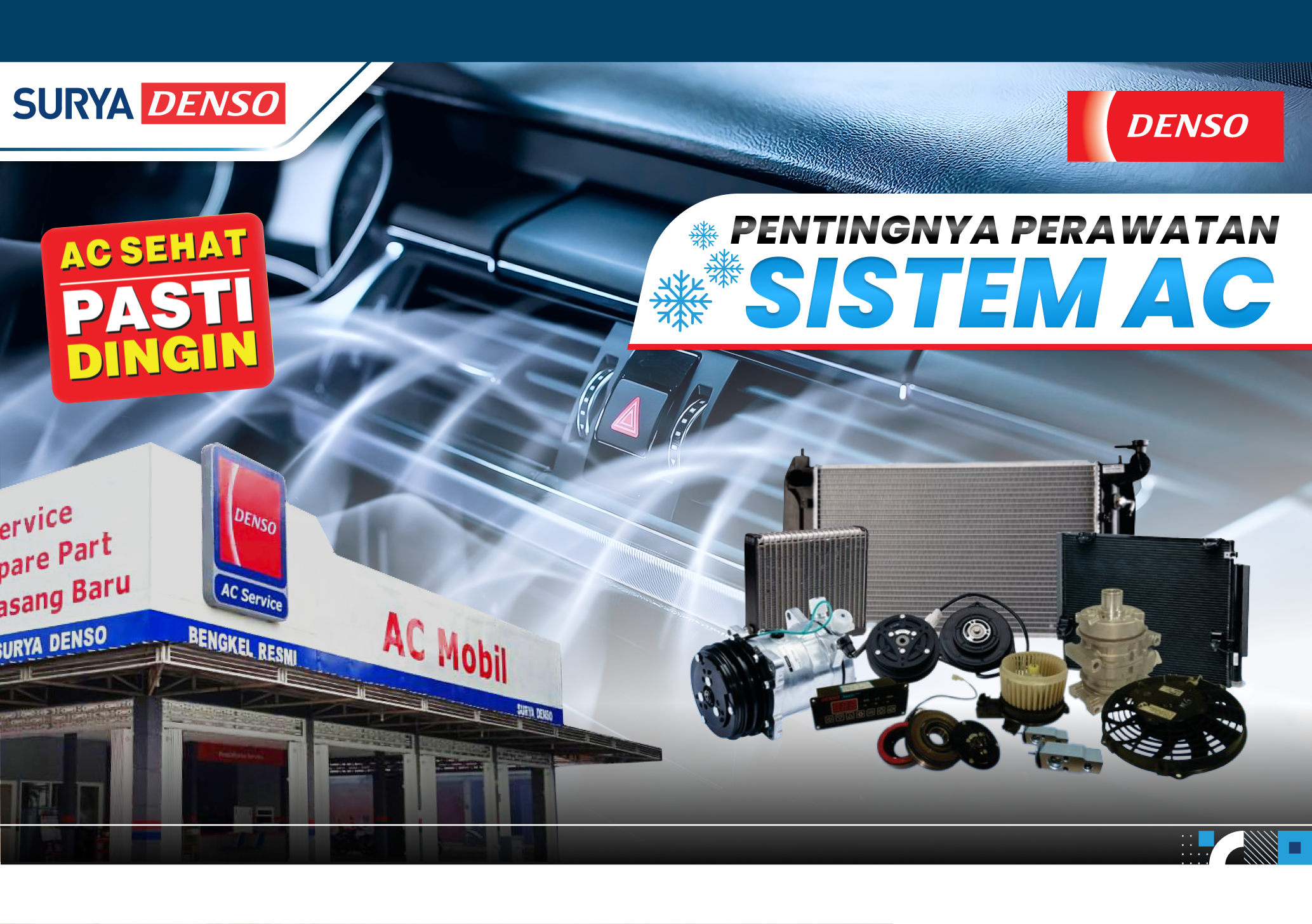Menggunakan suku cadang original DENSO untuk menjaga performa dan keawetan AC mobil.